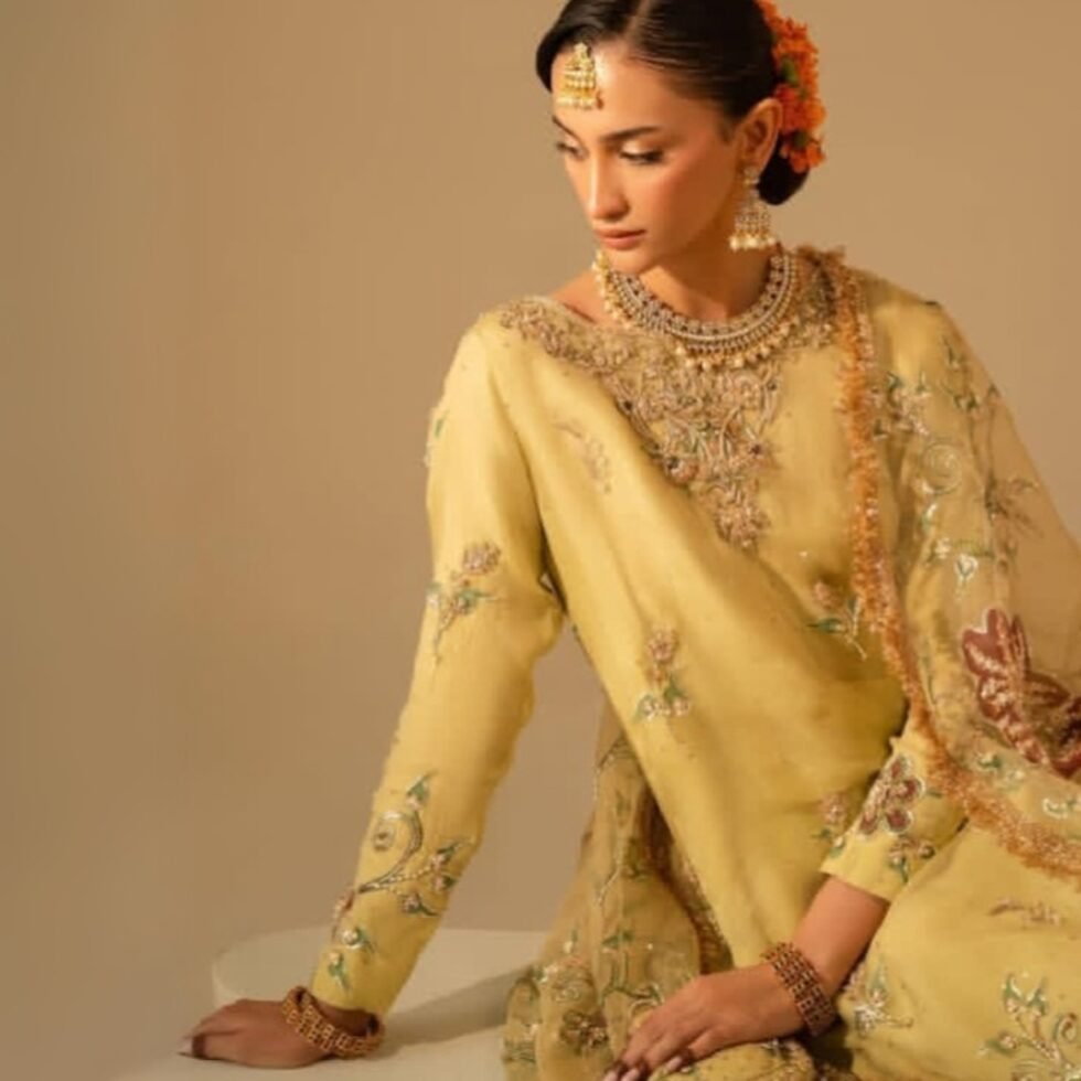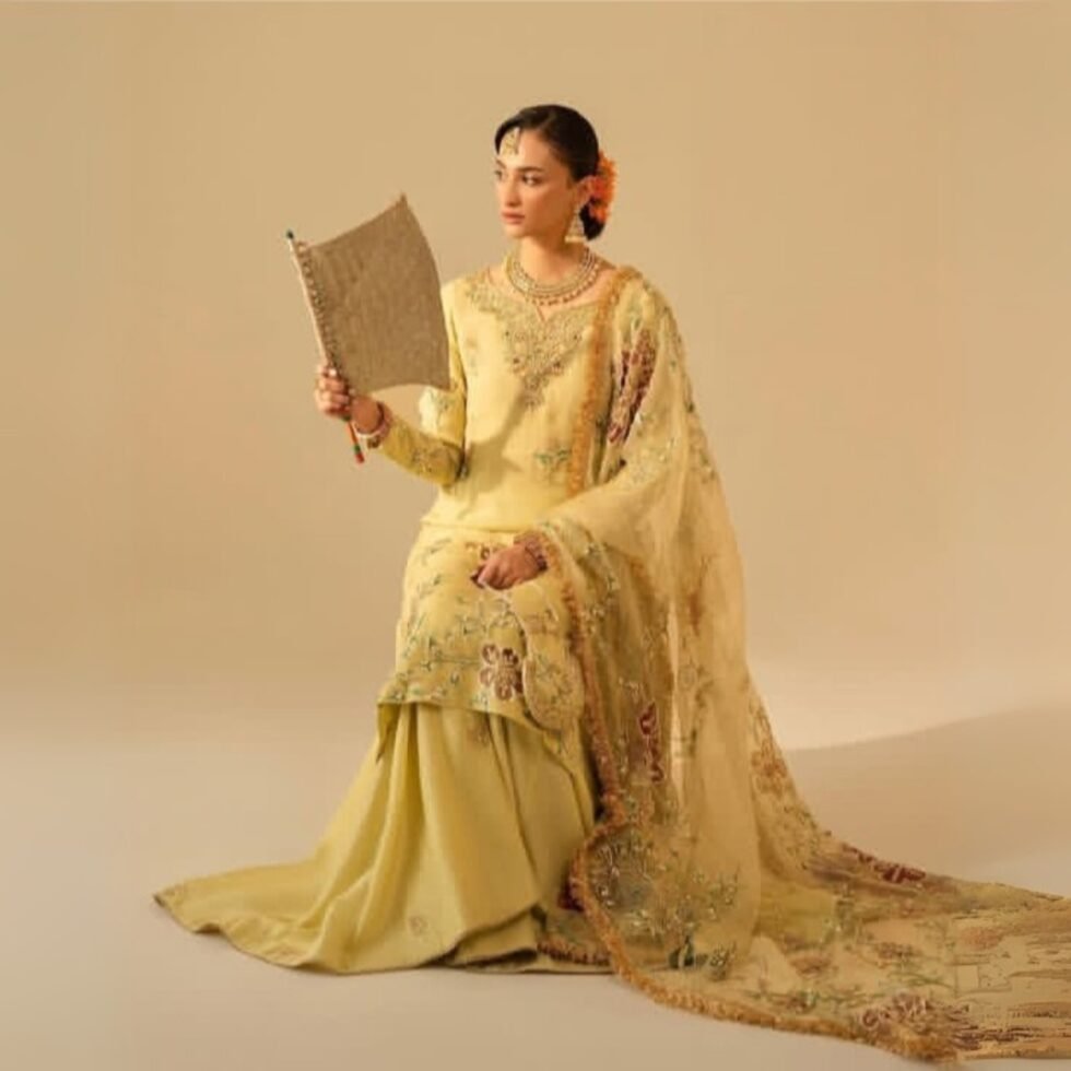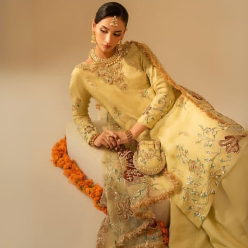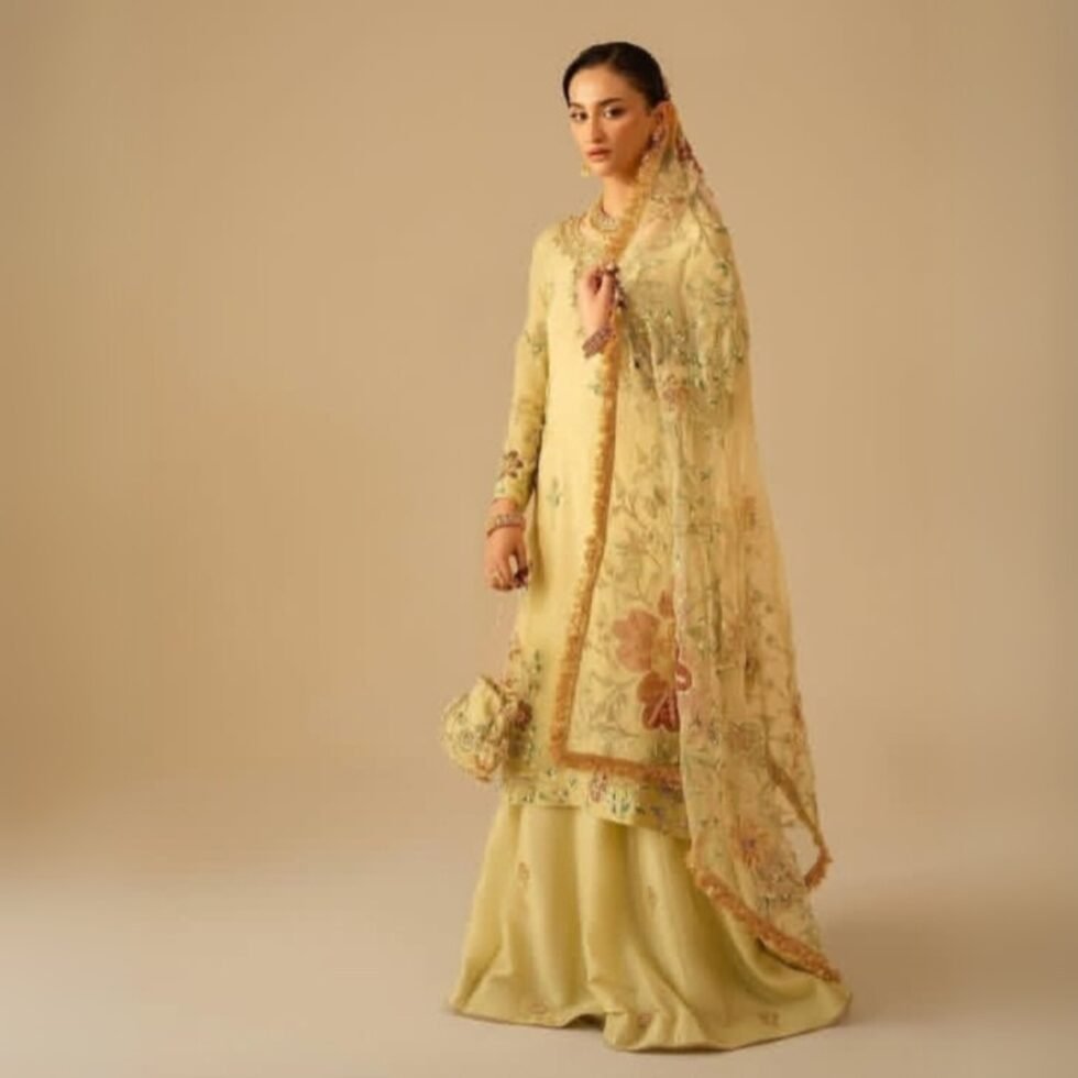The look is elevated with a hand-painted, embellished organza dupatta, flowing effortlessly and adding a soft, artistic dimension to the outfit. Paired with a richly crafted pure raw silk sharara (80gms), detailed with subtle embellishments, the silhouette blends classic charm with modern grace. Whether worn for formal gatherings or intimate celebrations, Amira embodies Zahoor e Jannat’s dedication to timeless eastern beauty and artisanal excellence.